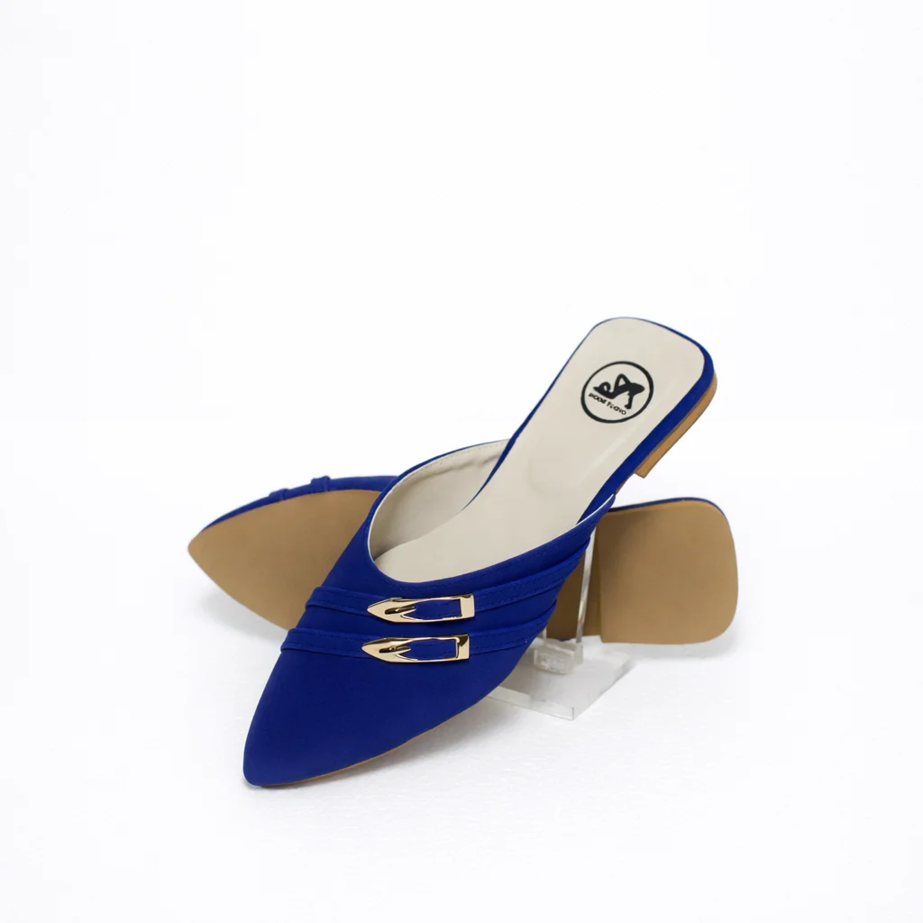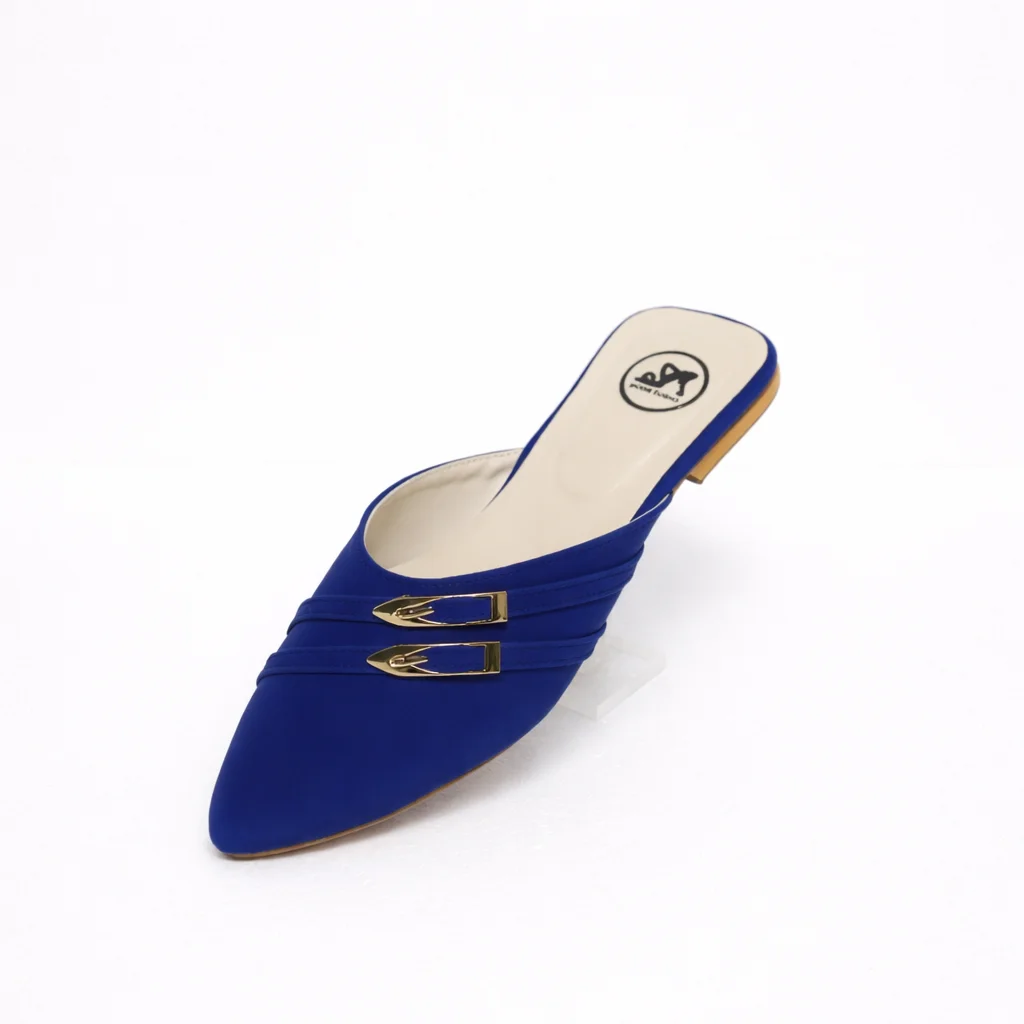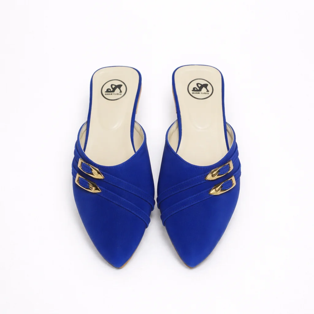 Step into effortless elegance with these Royal Blue Pointed Toe Mule Flats, designed for women who love style without compromising comfort. Crafted with a sleek pointed silhouette, these flats feature a luxurious matte blue finish enhanced by double gold buckle accents, adding a classy and premium touch.