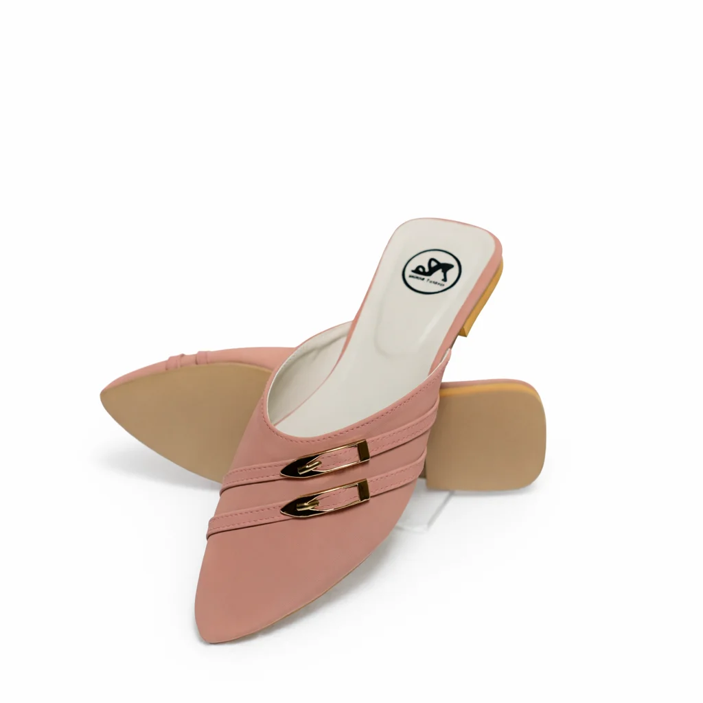 Step into effortless elegance with these Baby pink Pointed Toe Mule Flats, designed for women who love style without compromising comfort. Crafted with a sleek pointed silhouette, these flats feature a luxurious matte pink finish enhanced by double gold buckle accents, adding a classy and premium touch.